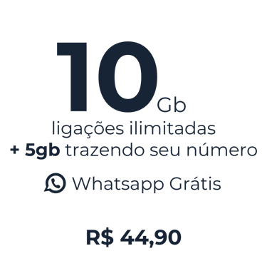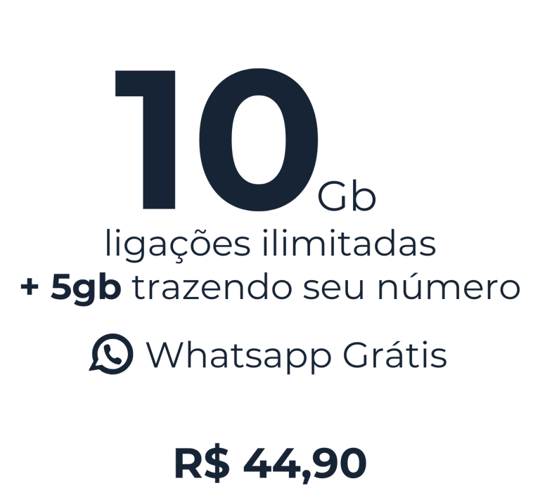 Por apenas R$44,90/mês, você ganha 10GB de internet e ligações ilimitadas para todo o Brasil. Trazendo seu número para a nossa operadora, você recebe mais 5GB de bônus! E, claro, aproveite todos os nossos benefícios exclusivos: WhatsApp liberado, internet que acumula, ligações ilimitadas, internet sem cortes, rede 5G e cobertura nacional.