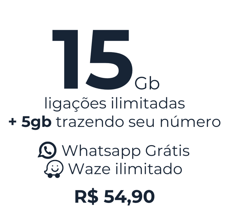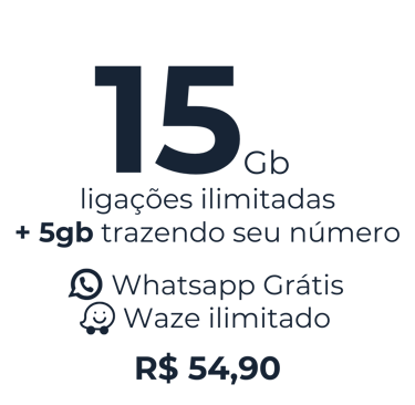Por apenas R$54,90/mês, você ganha 15GB de internet e ligações ilimitadas para todo o Brasil. Trazendo seu número para a nossa operadora, você recebe mais 5GB de bônus! E, claro, aproveite todos os nossos benefícios exclusivos: WhatsApp liberado, Waze ilimitado, internet que acumula, ligações ilimitadas, internet sem cortes, rede 5G e cobertura nacional.