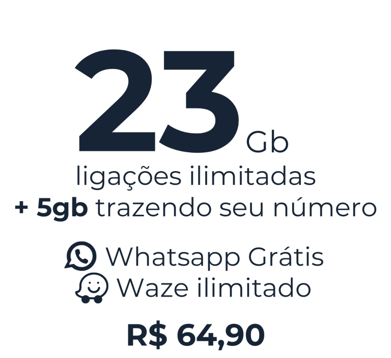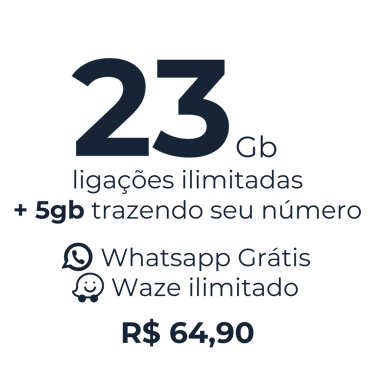 Por apenas R$64,90/mês, você ganha 23GB de internet e ligações ilimitadas para todo o Brasil. Trazendo seu número para a nossa operadora, você recebe mais 5GB de bônus! E, claro, aproveite todos os nossos benefícios exclusivos: WhatsApp liberado, Waze ilimitado, internet que acumula, ligações ilimitadas, internet sem cortes, rede 5G e cobertura nacional.