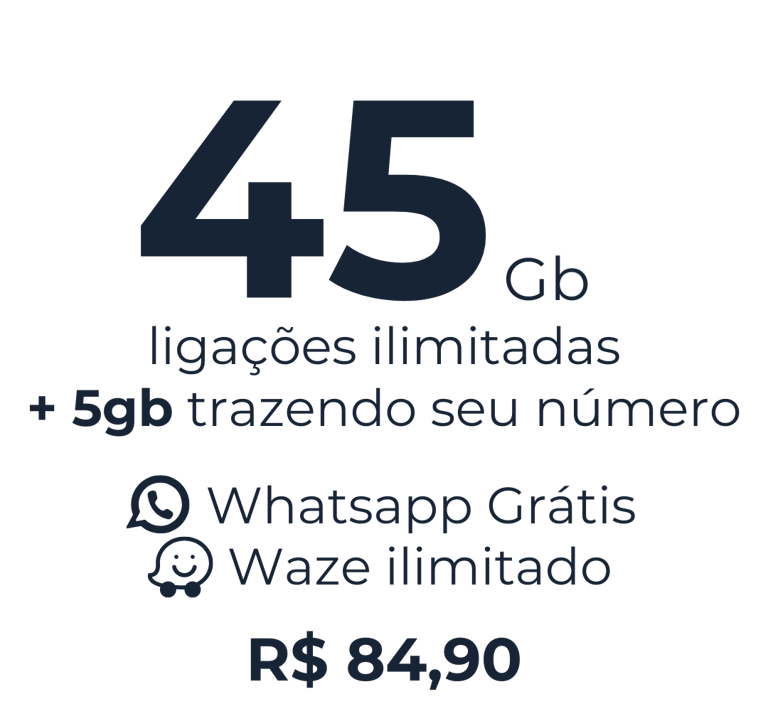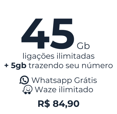 Por apenas R$84,90/mês, você ganha 45GB de internet e ligações ilimitadas para todo o Brasil. Trazendo seu número para a nossa operadora, você recebe mais 5GB de bônus! E, claro, aproveite todos os nossos benefícios exclusivos: WhatsApp liberado, Waze ilimitado, internet que acumula, ligações ilimitadas, internet sem cortes, rede 5G e cobertura nacional.